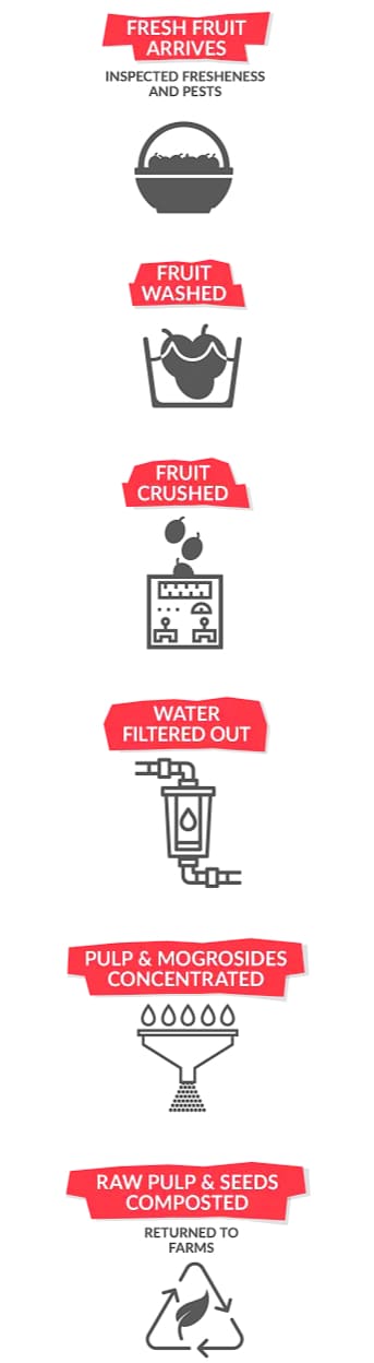 The entire fresh fruit is washed, crushed and slowly steeped in hot water. The sweet juice is filtered to remove fructose, sucrose and flavor-altering proteins, leaving mogroside in varying concentrations. The solution is condensed and dehydrated, leaving high purity monk fruit extract.