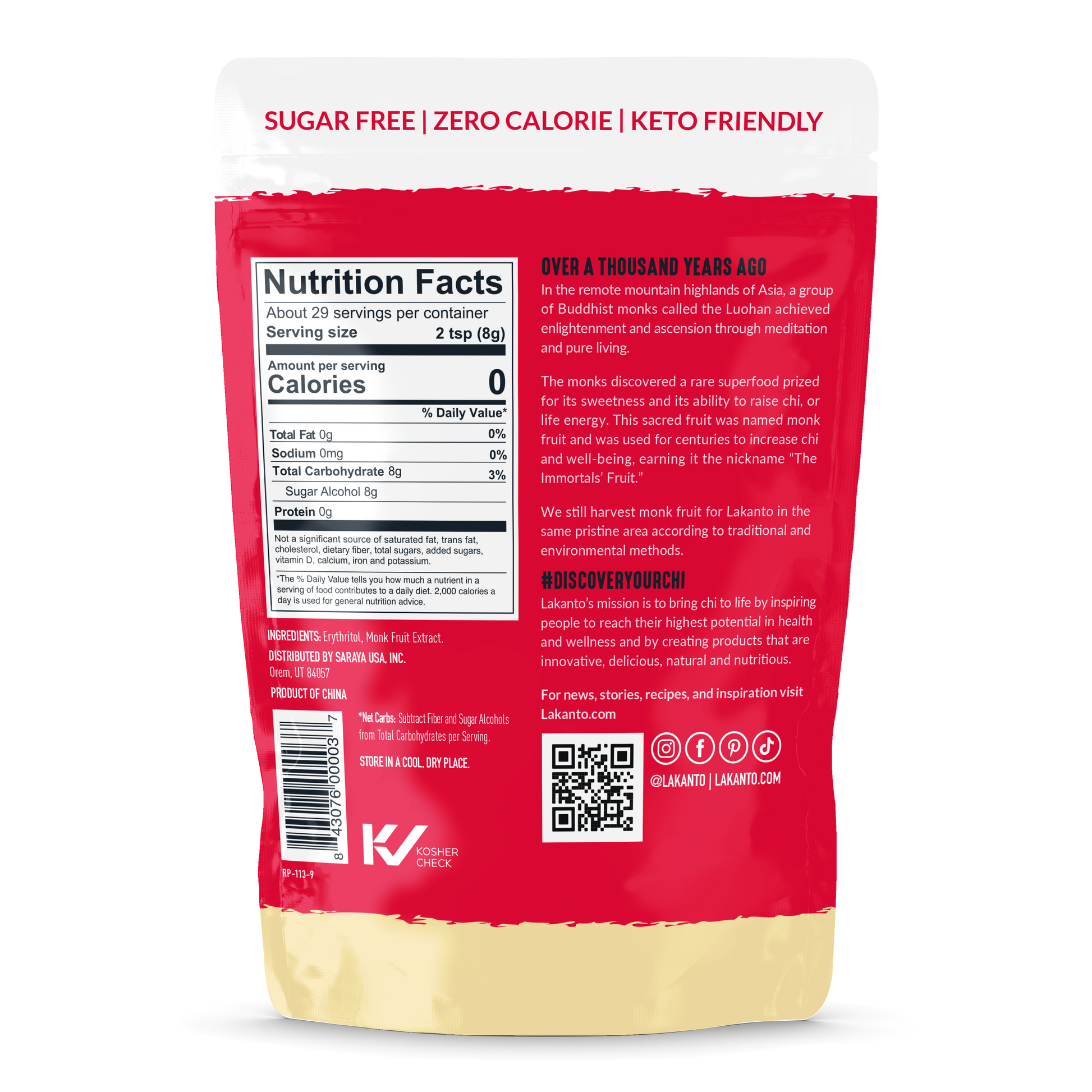 Lakanto Monk Fruit Sweetener is the only zero-calorie, zero glycemic sweetener that is just like sugar. It is made from Monk Fruit which was used for centuries in eastern traditional herbalism to increase chi and well-being, earning it the nickname The Immortals Fruit. We still grow and harvest Monk Fruit for LAKANTO in the same pristine area and according to traditional and environmental methods.