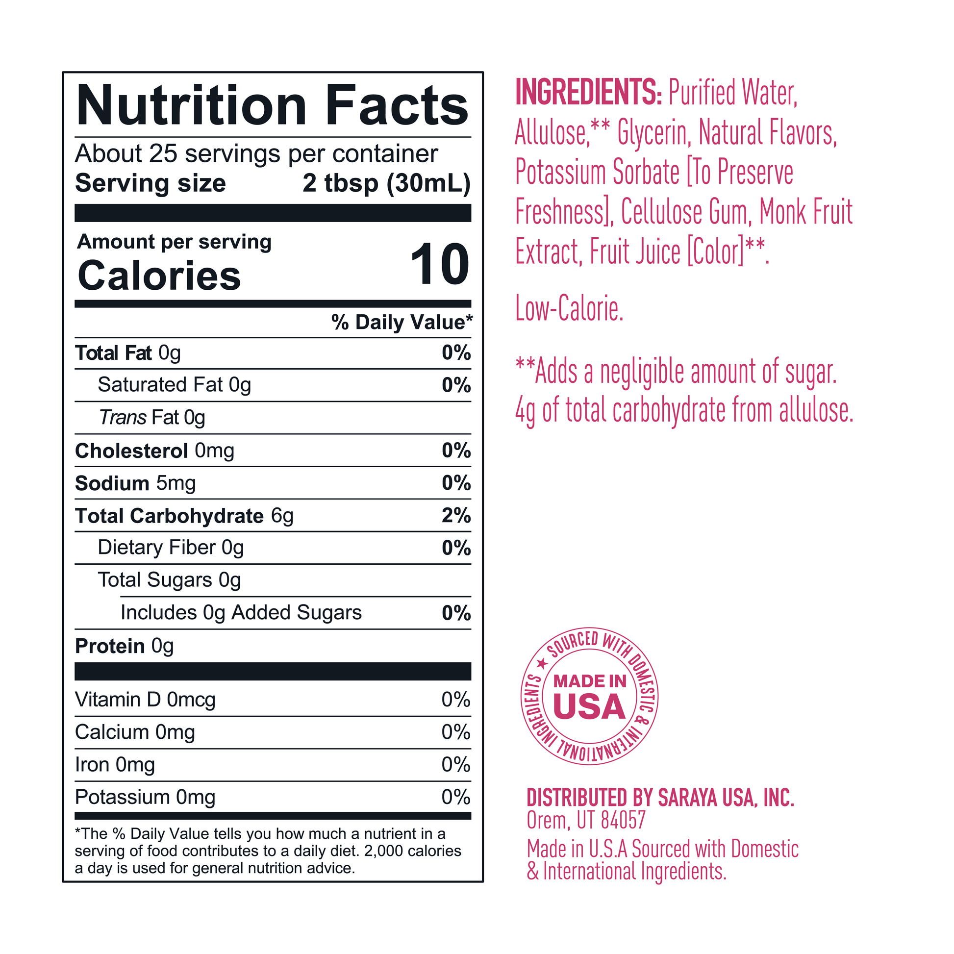 Purified Water, Allulose**, Glycerin, Natural Flavors, Potassium Sorbate [To Preserve Freshness], Cellulose Gum, Monk Fruit Extract, Citric Acid, Fruit Juice [Color]**